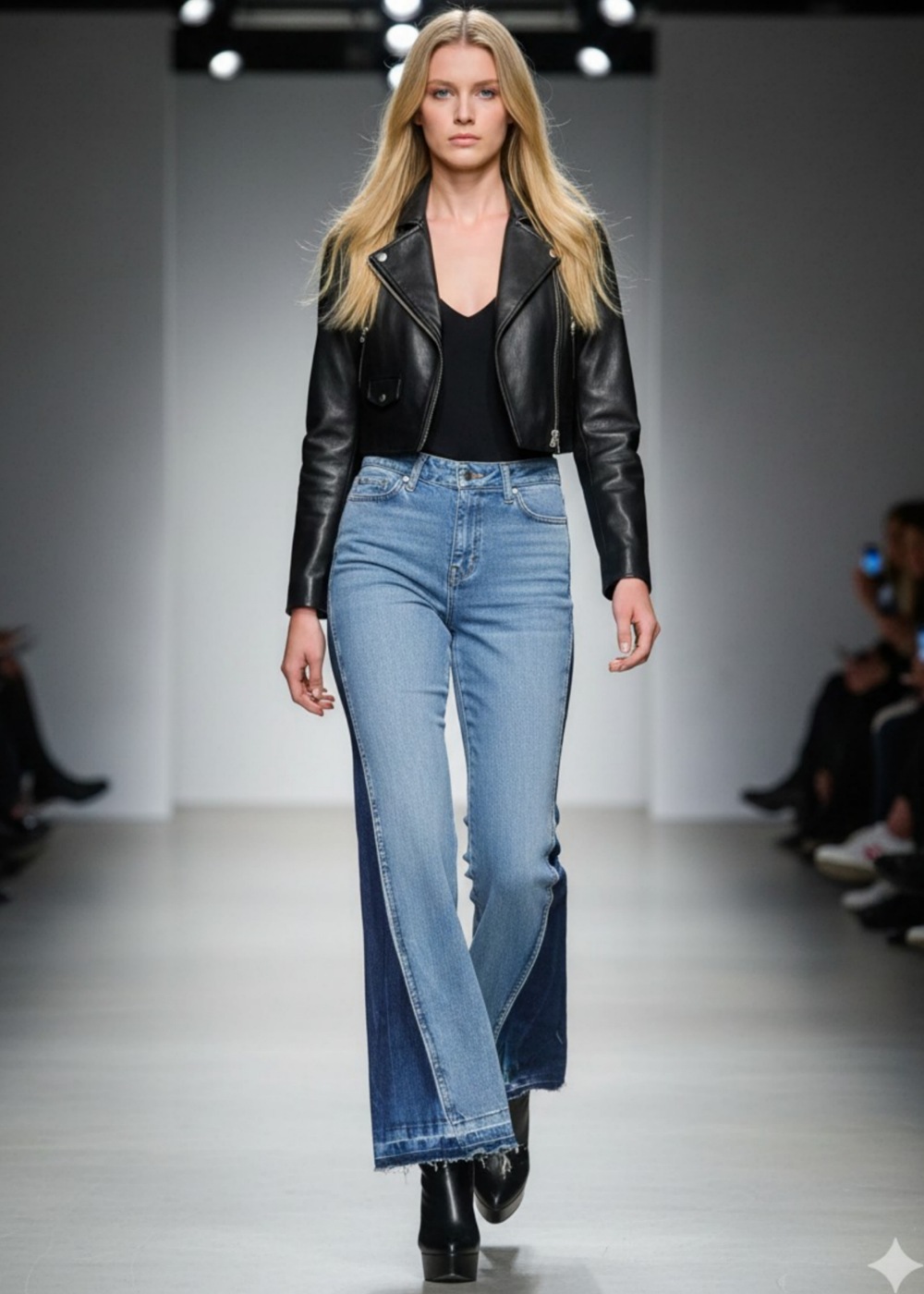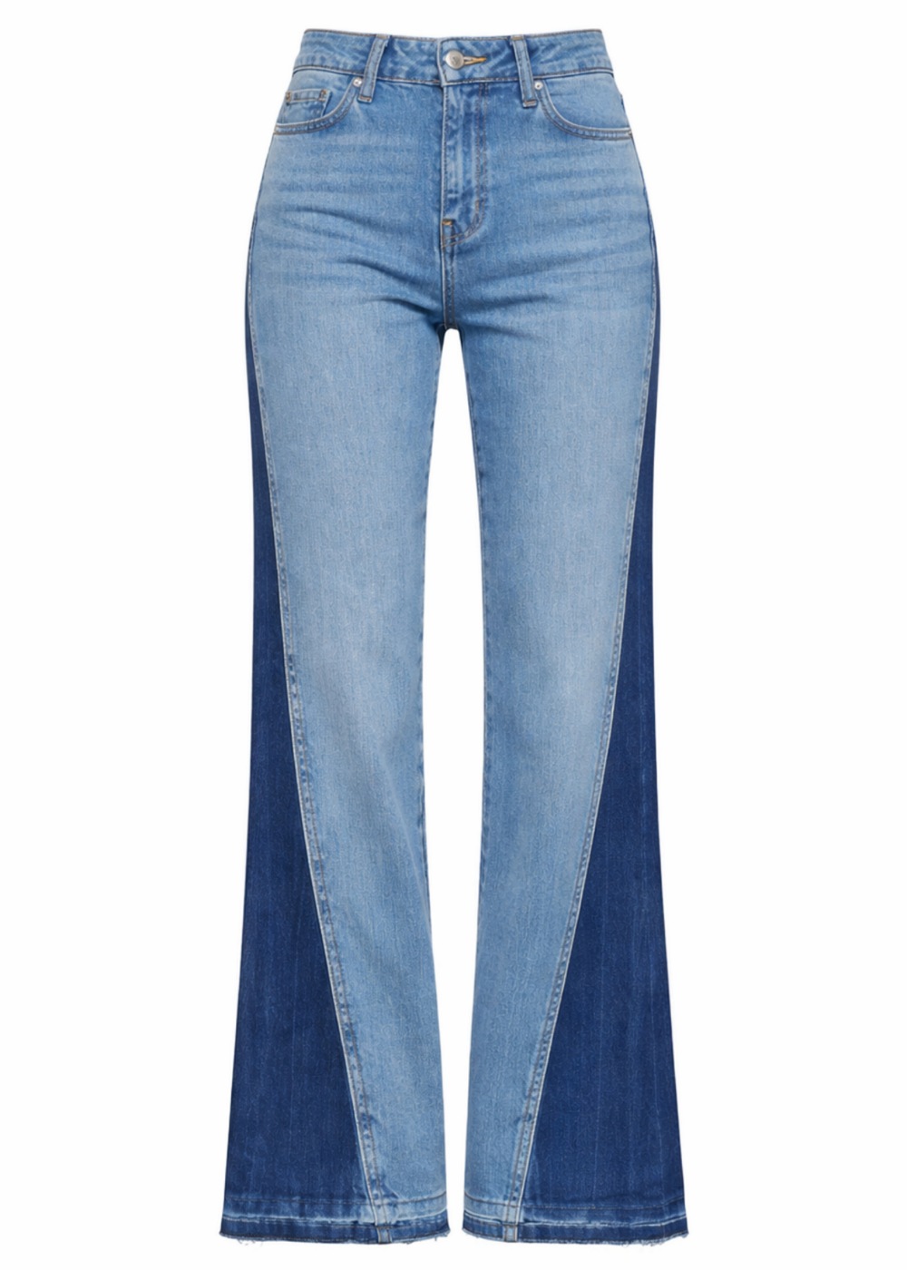 Ψηλόμεσο δίχρωμο τζιν που συνδυάζει μοντέρνο design με διαχρονική κομψότητα. Η αντίθεση ανάμεσα στο light blue μπροστινό μέρος και το darker denim στα πλαϊνά δημιουργεί ένα ιδιαίτερα κολακευτικό εφέ, αναδεικνύοντας τη σιλουέτα. Η flare γραμμή επιμηκύνει το πόδι, ενώ το raw τελείωμα στο στρίφωμα προσθέτει fashion χαρακτήρα και σύγχρονο ύφος.