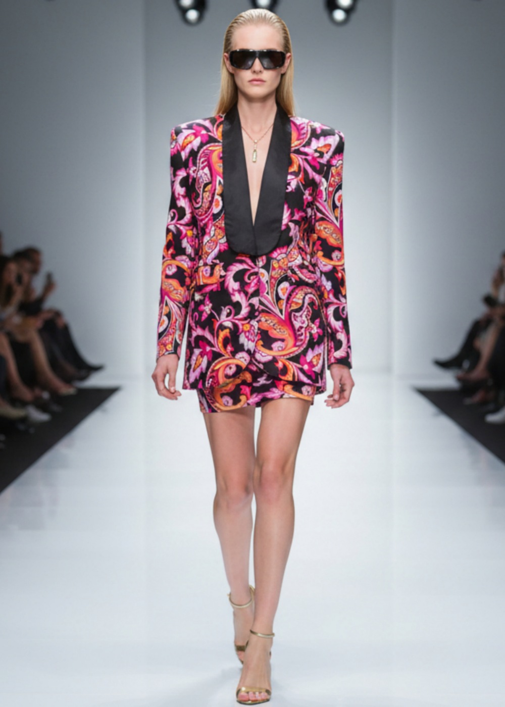 Paisley σακακι με Σατέν Πέτο.Εντυπωσιακό σακακι που μπορει να φορεθεί και ως mini φόρεμα με paisley print, σατέν πέτο και κομψή γραμμή που αγκαλιάζει το σώμα. Ένα statement κομμάτι με runway αισθητική, ιδανικό για βραδινές εμφανίσεις και ιδιαίτερες περιστάσεις.