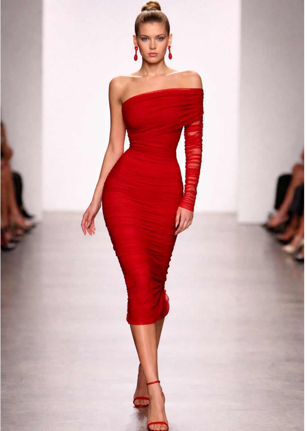 Εντυπωσιακό κόκκινο φόρεμα που αγκαλιάζει τη σιλουέτα και αναδεικνύει τη θηλυκότητα με απόλυτη κομψότητα. Σχεδιασμένο με ασύμμετρο off-shoulder ντεκολτέ, προσφέρει μια μοντέρνα και δυναμική γραμμή, ενώ το ένα μακρύ μανίκι από ημιδιάφανο ύφασμα με διακριτικό σούρωμα προσθέτει ιδιαίτερο χαρακτήρα και fashion-forward αισθητική.
